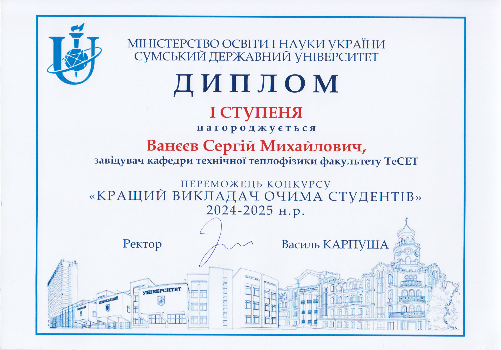 За підсумками конкурсу «Кращий викладач очима студентів» за результатами 2024-2025 н.р. дипломом І ступеня нагороджений завідувач кафедри технічної теплофізики Ванєєв Сергій Михайлович. Вітаємо переможця конкурсу та бажаємо нових досягнень!